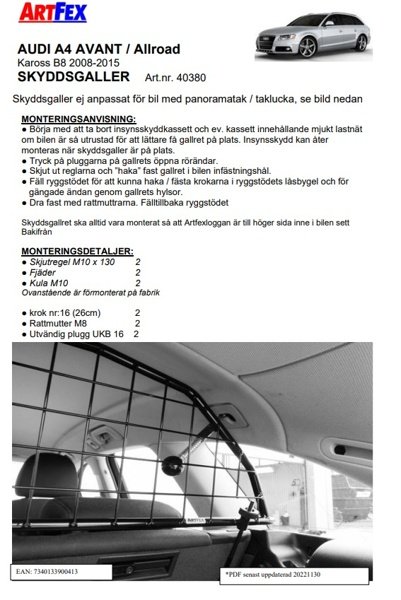 Modellanpassat lastgaller/hundgaller från Artfex till Audi A4 Avant B8 mellan 2008-2015