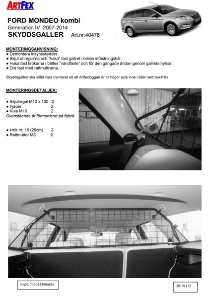 Modellanpassat lastgaller/hundgaller från Artfex till Ford Mondeo Kombi IV mellan 2007-2014