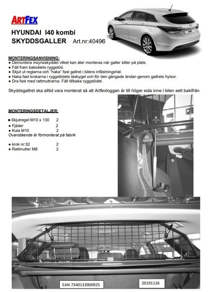 Modellanpassat lastgaller/hundgaller från Artfex till Hyundai i40 Kombi från 2012->