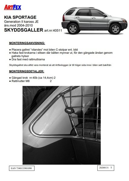 Modellanpassat lastgaller/hundgaller från Artfex till Kia Sportage II (JE) mellan 2004-2011