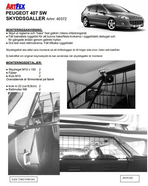 Modellanpassat lastgaller/hundgaller från Artfex till Peugeot 407 SW mellan 2004-2011