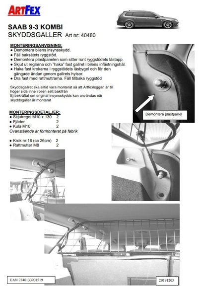 Modellanpassat lastgaller/hundgaller från Artfex till Saab 9-3 Kombi mellan 2005-2012