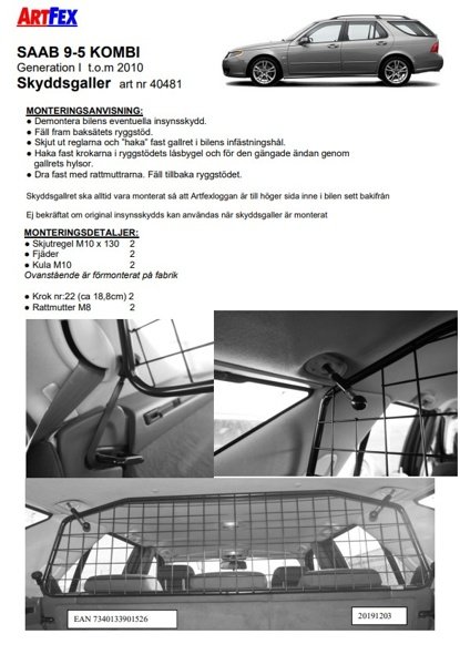 Modellanpassat lastgaller/hundgaller från Artfex till Saab 9-5 Kombi mellan 1997-2010