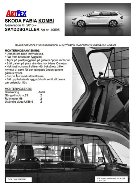 Modellanpassat lastgaller/hundgaller från Artfex till Skoda Fabia Kombi III mellan 2015-2021