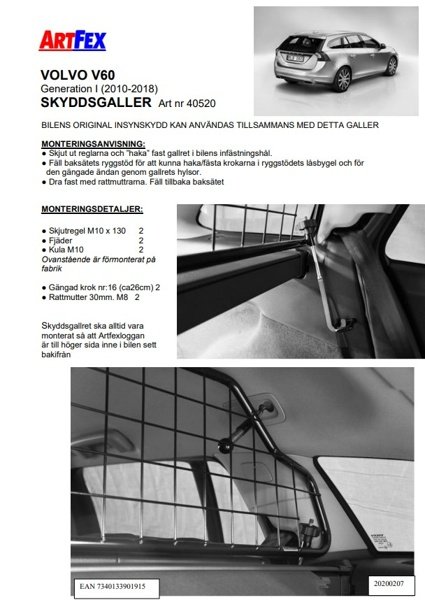 Modellanpassat lastgaller/hundgaller från Artfex till Volvo V60 I mellan 2011-2018