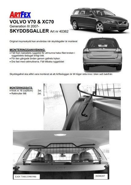 Modellanpassat lastgaller/hundgaller från Artfex till Volvo V70/XC70 III mellan 2007-2016.