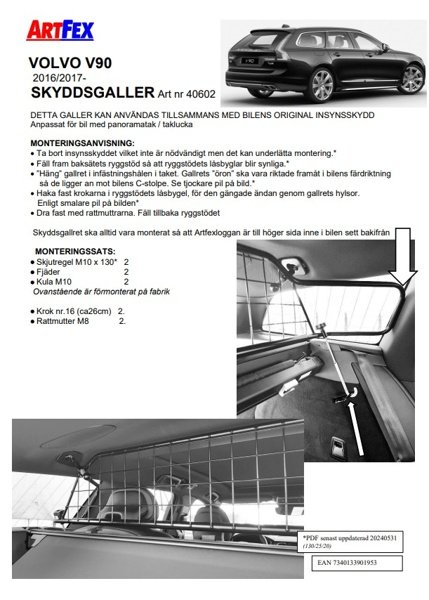 Modellanpassat lastgaller/hundgaller från Artfex till Volvo V90 från 2016->