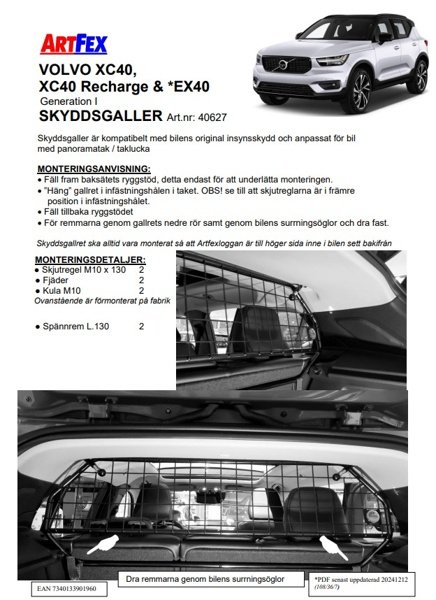 Modellanpassat lastgaller/hundgaller från Artfex till Volvo XC40 II från 2017->