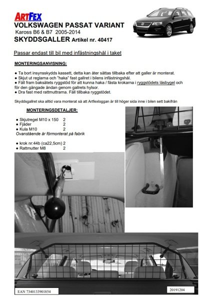 Modellanpassat lastgaller/hundgaller från Artfex till VW Passat B6-B7 Kombi mellan 2005-2015
