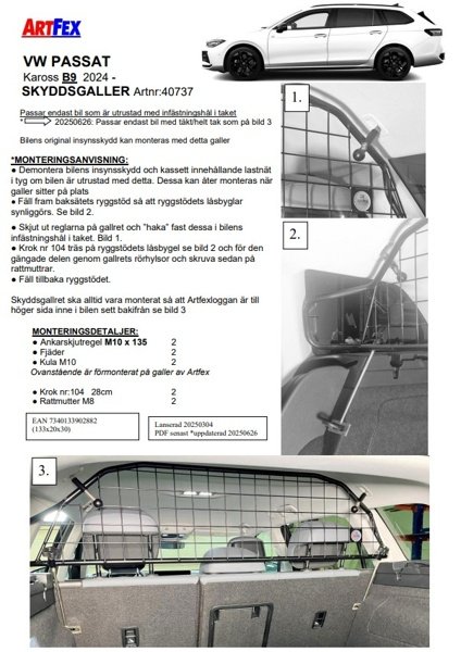 Modellanpassat lastgaller/hundgaller från Artfex till VW Passat B9 från 2024->