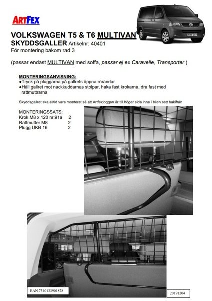 Modellanpassat lastgaller/hundgaller från Artfex till VW T5 T6 Multivan