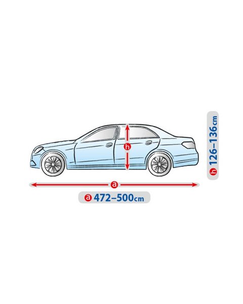 Så mäter du rätt – före köp: Mät bilens längd från stötfångare till stötfångare samt höjd från tröskel till tak. Detta kapell är anpassat för längd 472–500 cm och höjd 126–136 cm – perfekt för extra stora premiumsedaner.