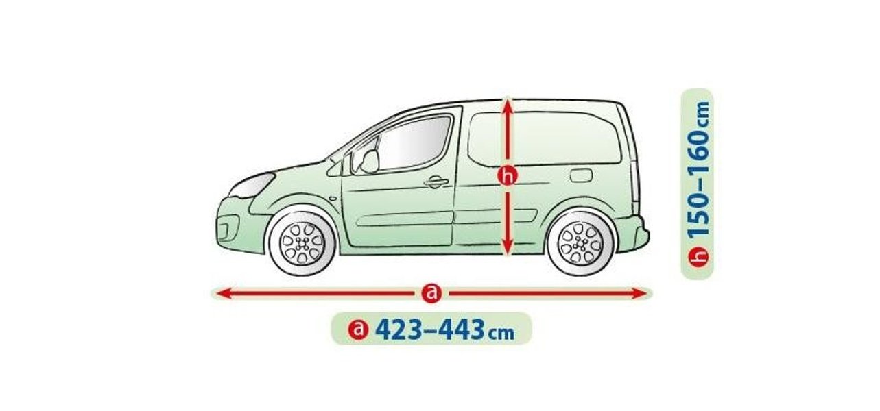 Så mäter du rätt – före köp: Mät bilens längd från stötfångare till stötfångare samt höjd från tröskel till tak. Detta kapell är anpassat för längd 423–443 cm och höjd 150–160 cm – perfekt för fordon i L LAV-klassen.