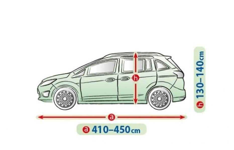 Så mäter du rätt – före köp: Mät bilens längd från stötfångare till stötfångare samt höjd från tröskel till tak. Detta kapell är anpassat för längd 410–450 cm och höjd 130–140 cm – perfekt för kompakta minivans i L-klassen.