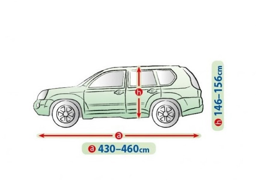 Så mäter du rätt – före köp: Mät bilens längd från stötfångare till stötfångare samt höjd från tröskel till tak. Detta kapell är anpassat för längd 430–460 cm och höjd 145–156 cm – perfekt för SUV-modeller i L-klassen.
