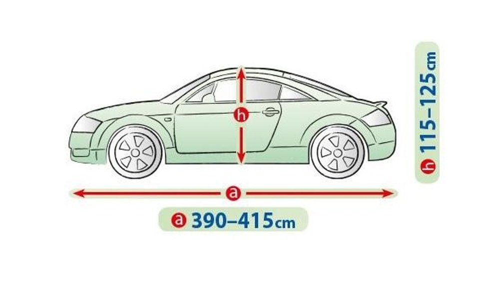 Så mäter du rätt – före köp: Mät bilens längd från stötfångare till stötfångare samt höjd från tröskel till tak. Detta kapell är anpassat för längd 390–415 cm och höjd 115–125 cm – perfekt för sportigare coupéer i M-storleken.