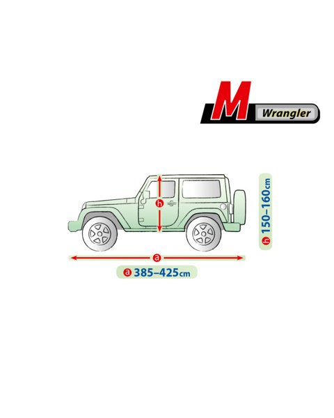 M Wrangler passar bilar med en längd på 385–425 cm och höjd 150–160 cm. Det är särskilt utvecklat för Jeep Wrangler men fungerar även för andra SUV- och offroadmodeller i samma storlek. Mät alltid bilens mått innan köp för att försäkra dig om optimal passform.