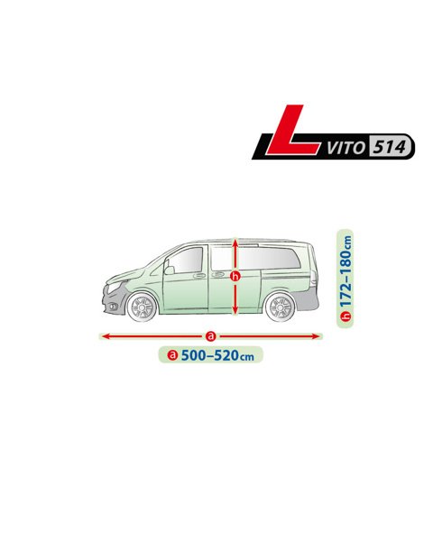 L Vito 514 passar fordon med en längd på 500–520 cm och höjd 172–180 cm. Mät alltid bilen noggrant före köp för att säkerställa optimal passform – särskilt viktigt för campervans med takräcken, solpaneler eller annan extrautrustning.