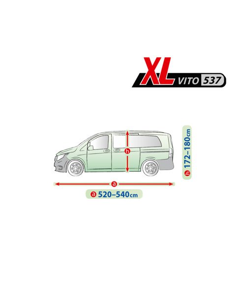 XL Vito 514 passar fordon med en längd på 520–540 cm och höjd 172–180 cm. Kontrollera alltid fordonets mått innan köp för att säkerställa korrekt passform – särskilt viktigt för campervans med extra utrustning som solpaneler eller takräcken.