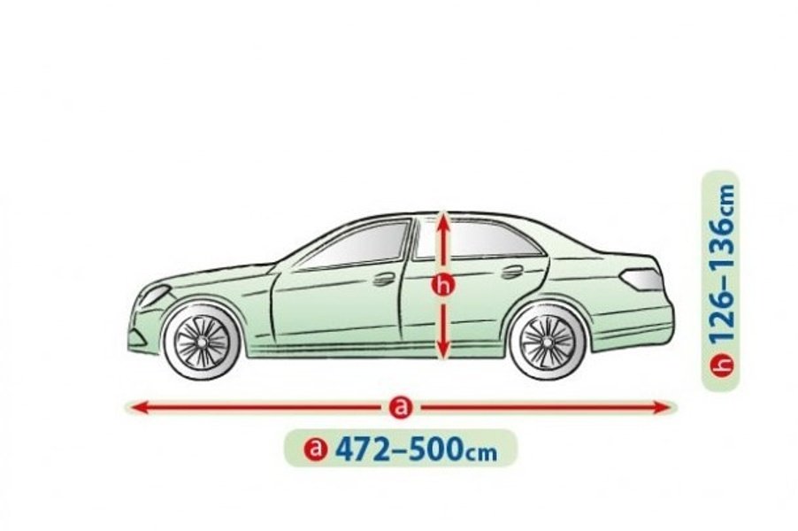 Så mäter du rätt – före köp: Mät bilens längd från stötfångare till stötfångare samt höjd från tröskel till tak. Detta kapell är anpassat för längd 472–500 cm och höjd 126–136 cm – perfekt för stora sedans i XL-klassen.