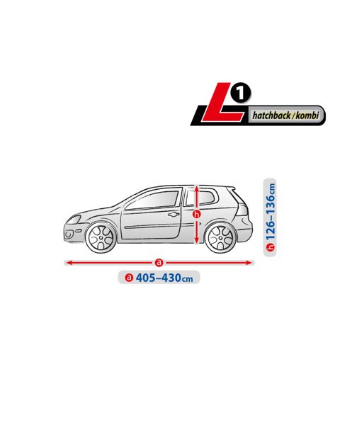 L1 Hatchback/Kombi passar bilar med en längd på 405–430 cm och höjd 126–136 cm. Kontrollera alltid bilens mått innan beställning för att säkerställa rätt passform.