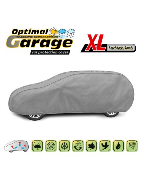Optimal Garage från Kegel är ett slitstarkt och pålitligt bilöverdrag som erbjuder mer skydd än Basic-serien. Det förstärkta 3-lagers tyget skyddar effektivt mot regn, snö, smuts och UV-strålning. Tack vare sin förbättrade konstruktion och elastiska kanter ger det en stabil passform även på stora kombimodeller.