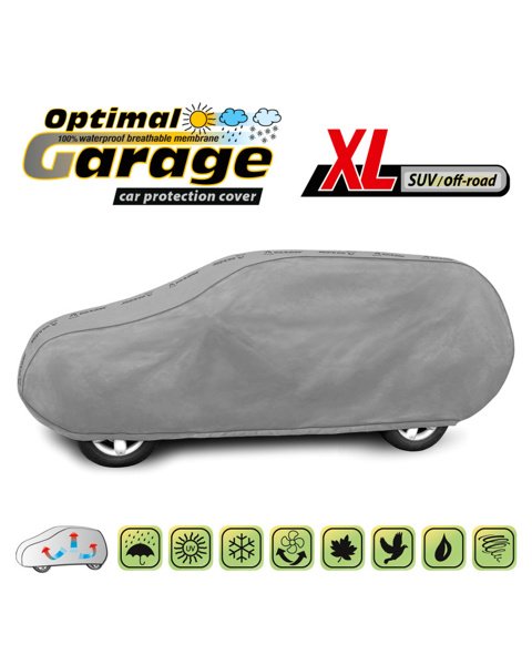Optimal Garage från Kegel är en premiumlösning för dig som vill ha ett slitstarkt och pålitligt skydd för din SUV. Det förstärkta 3-lagers tyget skyddar effektivt mot regn, snö, smuts och UV-strålning. Tack vare sin förbättrade konstruktion och elastiska kanter får du en stabil passform även på de största SUV-modellerna i XL-klassen.