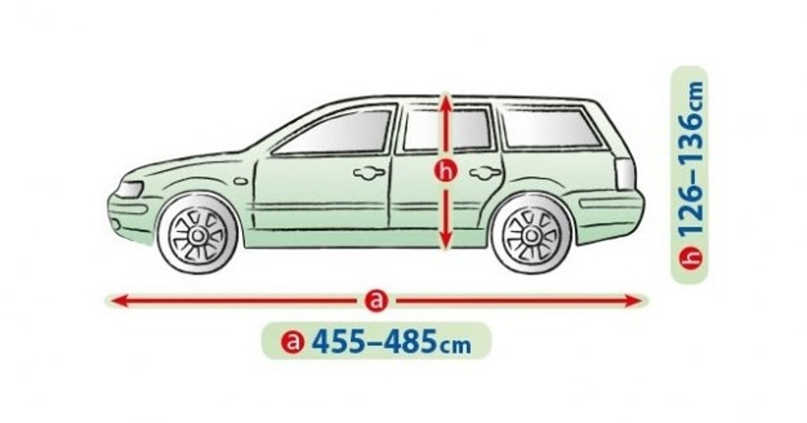 Så mäter du rätt – före köp: Mät bilens längd från stötfångare till stötfångare samt höjd från tröskel till tak. Detta kapell är anpassat för längd 455–485 cm och höjd 126–136 cm – perfekt för stora kombibilar och hatchbacks i XL-klassen.