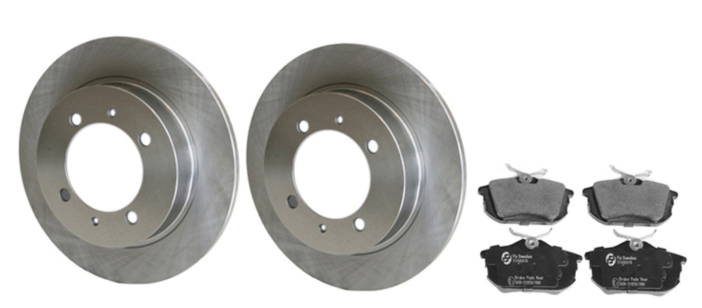 Denna bromssats är anpassad för Volvos tidiga S/V40-plattform och används vid bakaxel med solida bromsskivor. Slitna bakbromsar kan visa sig genom sämre bromsverkan, missljud eller ojämnt slitage – ett samlat byte av skivor och belägg ger ett pålitligt resultat.