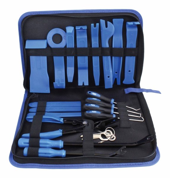 Ett komplett och mångsidigt 24 delars demonteringskit utvecklat för att säkert lossa och montera känsliga plastdetaljer i både interiör och exteriör.