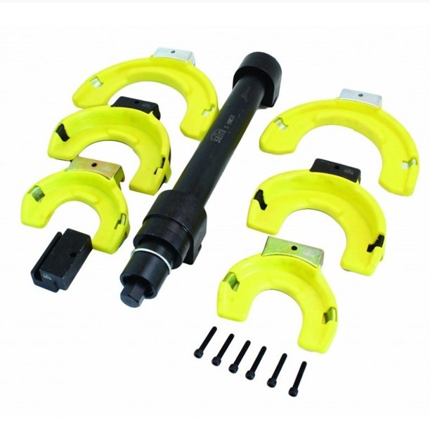 Verktyget håller fjädern stabilt på plats under arbetet och levereras med utbytbara armar för att passa de flesta fjäderstorlekar och bilmodeller.
