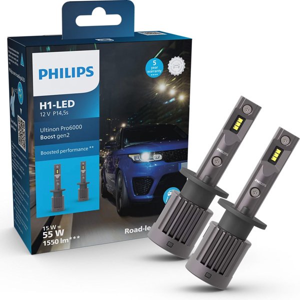 Snabbfakta: Trafikgodkänd H1 LED-konverteringslampa för helljus och halvljus. Ersätter halogen H1-lampor med Philips Ultinon Pro6000 Boost Gen 2 – den senaste generationens LED för ökad sikt och bättre kontroll.