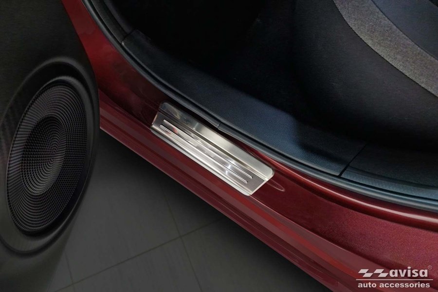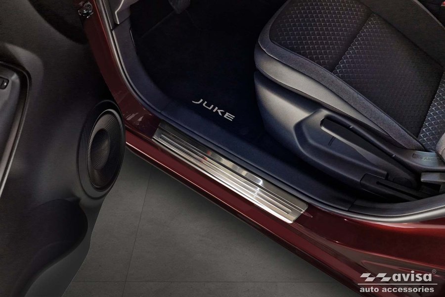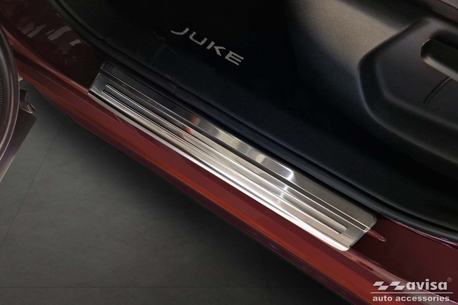 Modellanpassade instegslister i stål med en borstad yta till din Nissan Juke II från 2019-> Ge din bil ett exlusivare utseende och samtidigt skydda dina trösklar. Monteras lätt på din bil med förmonterad 3M-tejp.