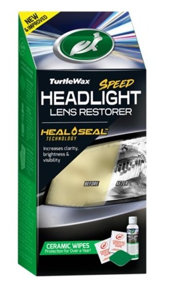 Turtle Wax Speed Headlight Restorer Kit är ett kit som förnyar matta och missfärgade strålkastarglas av plast.